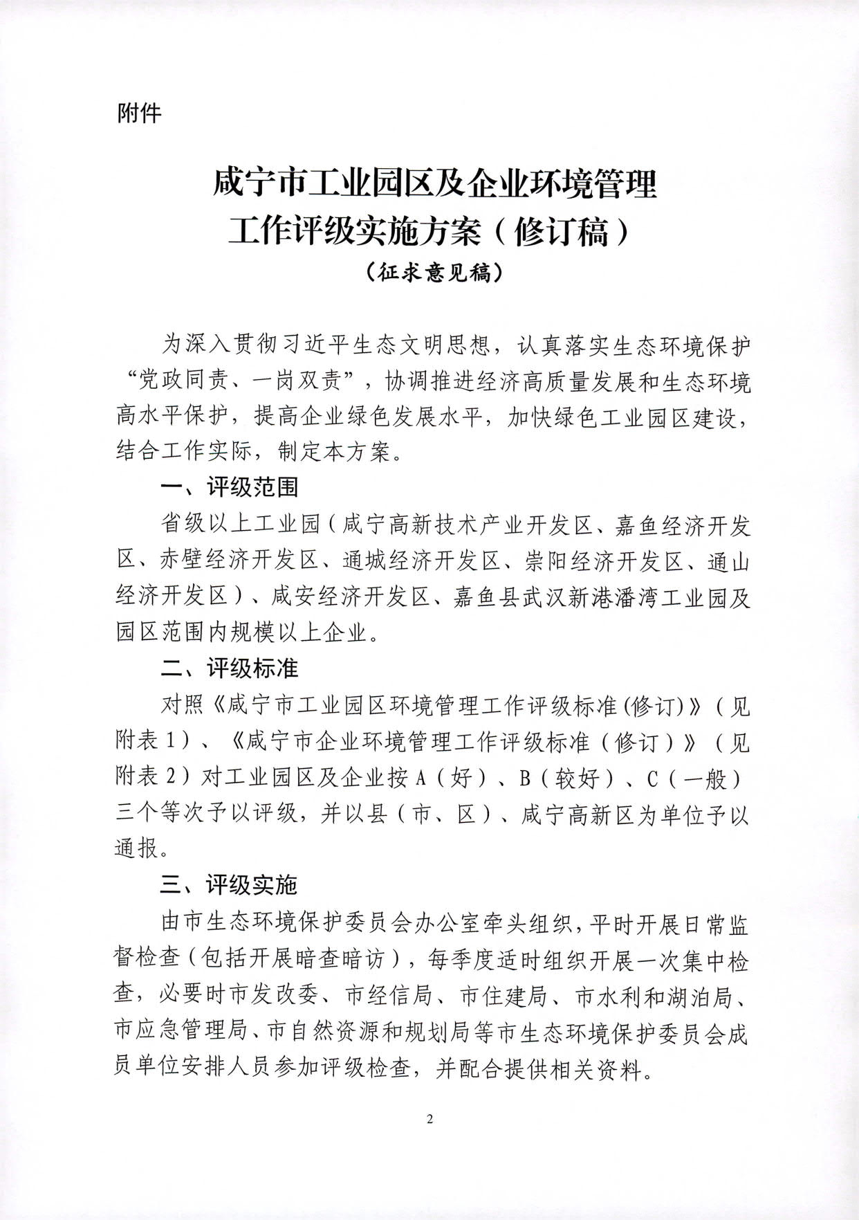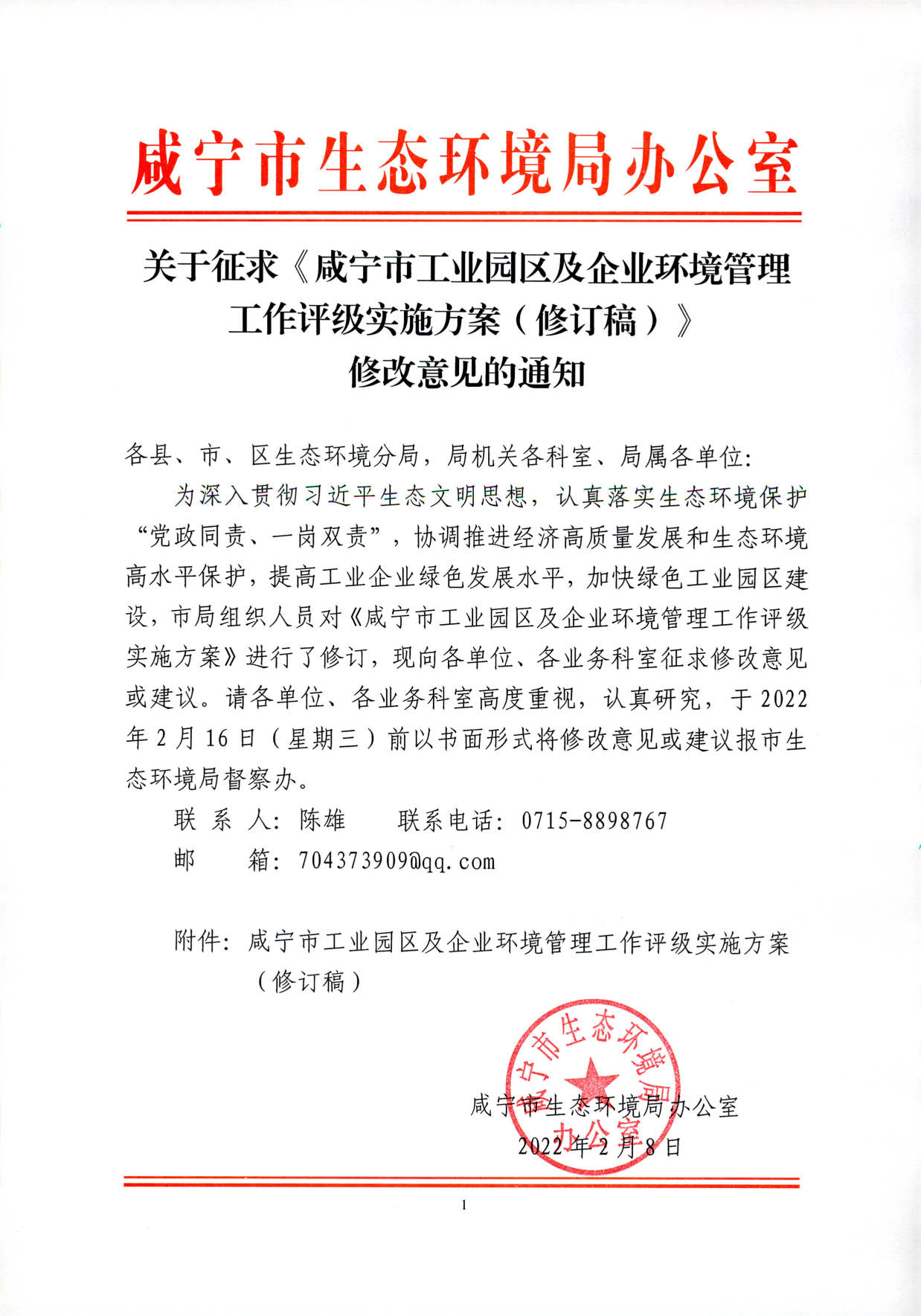 名       称: 关于征求《咸宁市工业园区及企业环境管理工作评级实施方案(修订稿)》修改意见的通知 发布日期: 2022年02月14日